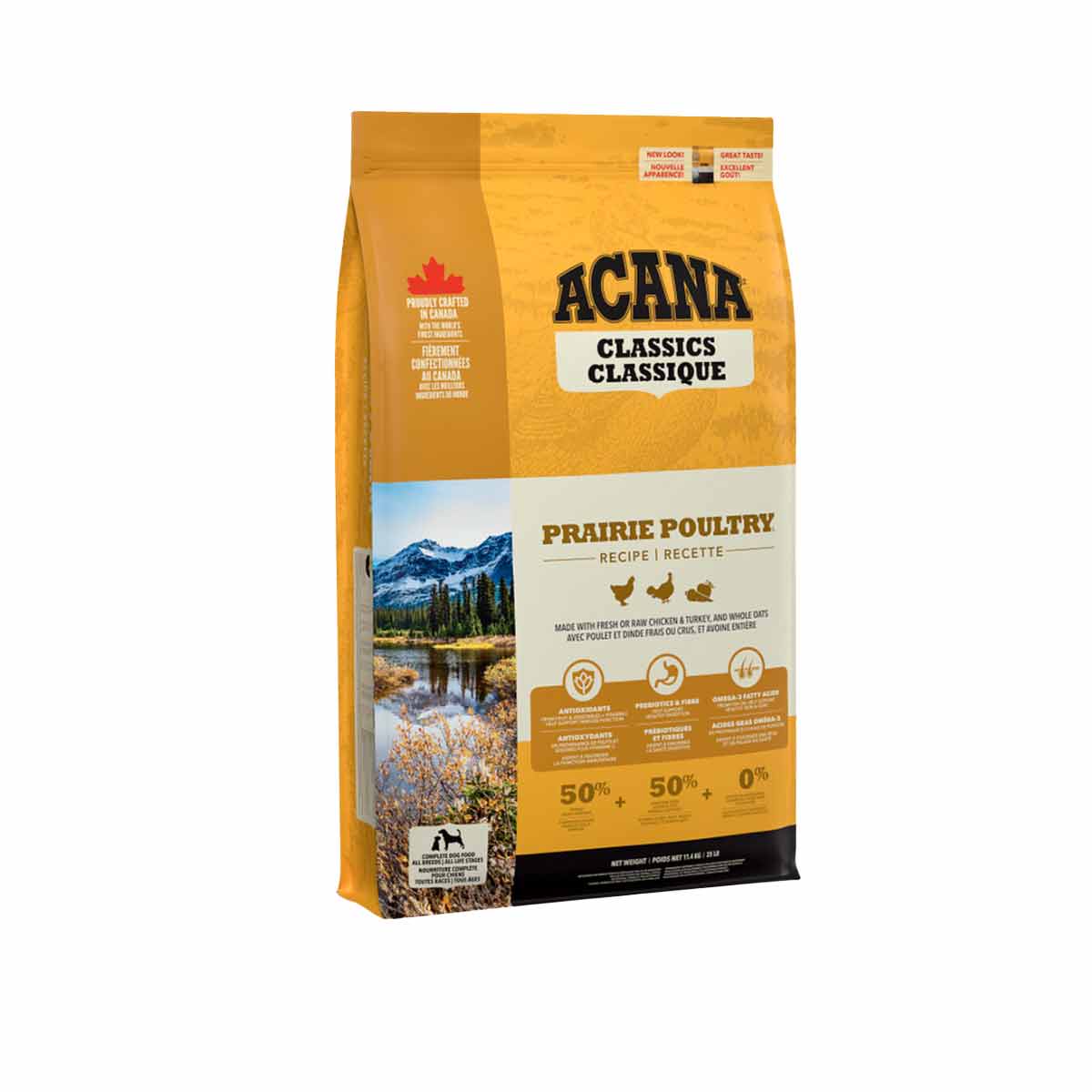 Acana Classic Prairie Poultry es un alimento indicado para perros de todas las edades y razas. Elaborado con pollo y pavo criados en libertad además de huevos, todo entregado FRESCO o CRUDO diariamente en proporciones de PresaEntera™ para nutrir a tu perro por completo.