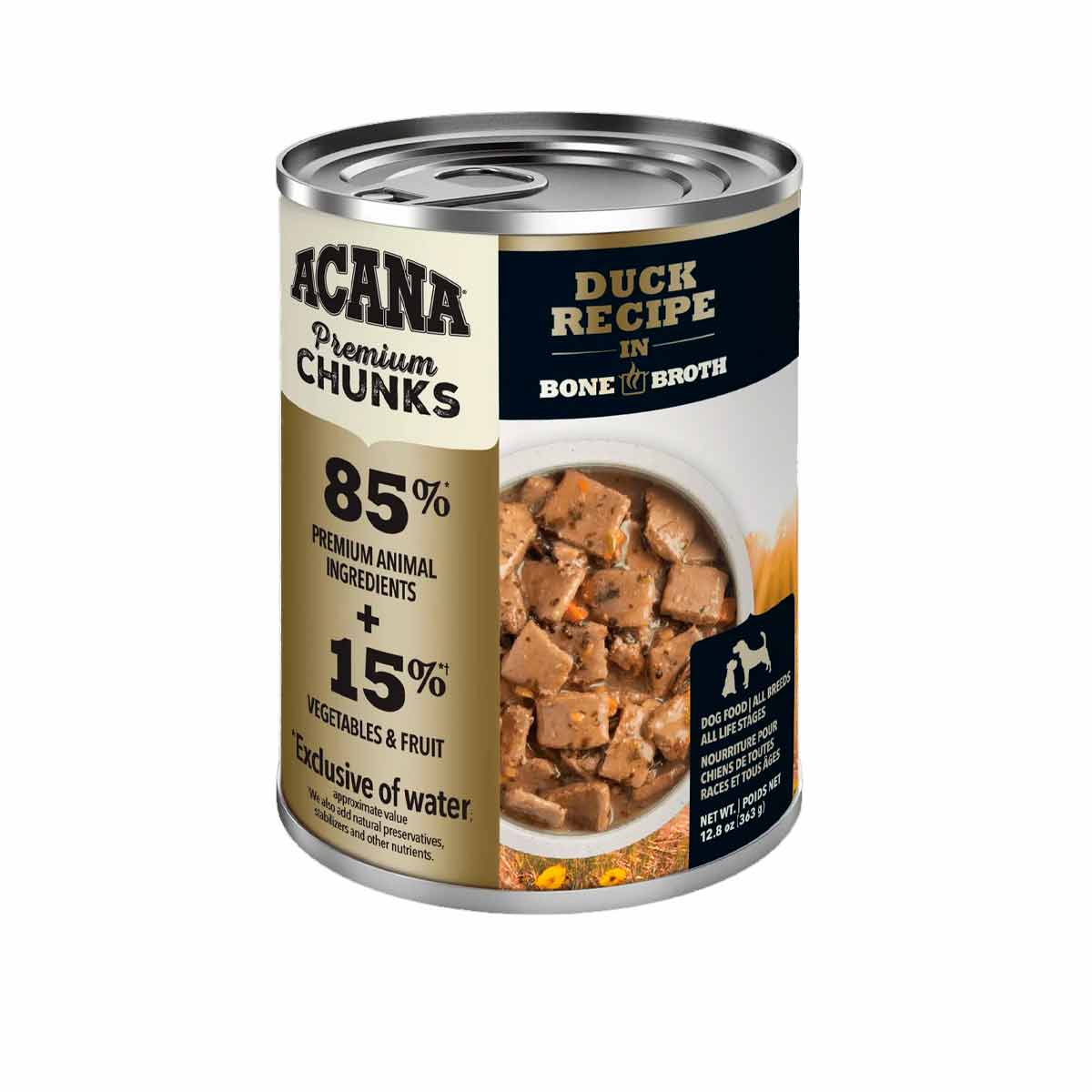 Acana Lata Perro Duck in Bone Broth es un alimento húmedo de alta calidad diseñado para perros de todas las razas y etapas de vida. Esta fórmula se compone de un 85% de ingredientes animales, incluyendo trozos visibles pato de alta calidad en un caldo nutritivo, y un 15% de frutas y verduras visibles, todo ello en una sabrosa base de caldo de huesos que su perro adorará. Elaborado con pato como primer ingrediente, una fuente de proteína magra y altamente digestible. Esta receta está libre de granos, lo que la hace adecuada para perros con sensibilidades alimentarias o alergias.