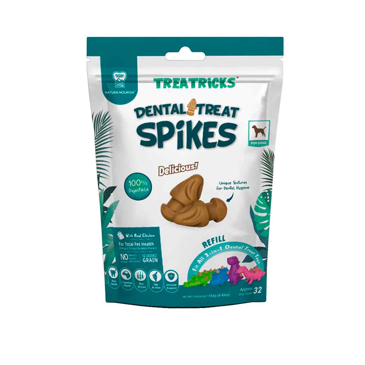 Natura Nourish Snack Dental Treat Spikes son unos deliciosos snacks para perros mayores de 6 meses. Libre de granos 100%. Fácil de digerir. Sabor a pollo. A tu peludo le encantará masticar estos deliciosos snacks y a la vez limpiará sus dientes y encías, evitará el mal aliento y mantendrá su boca fresca y saludable. Perfectos para rellenar los juguetes TREATRICKS que están disponibles en diversos modelos, y que proporcionarán horas de diversión a tu peludo mientras juega. También se pueden dar como premio individualmente.